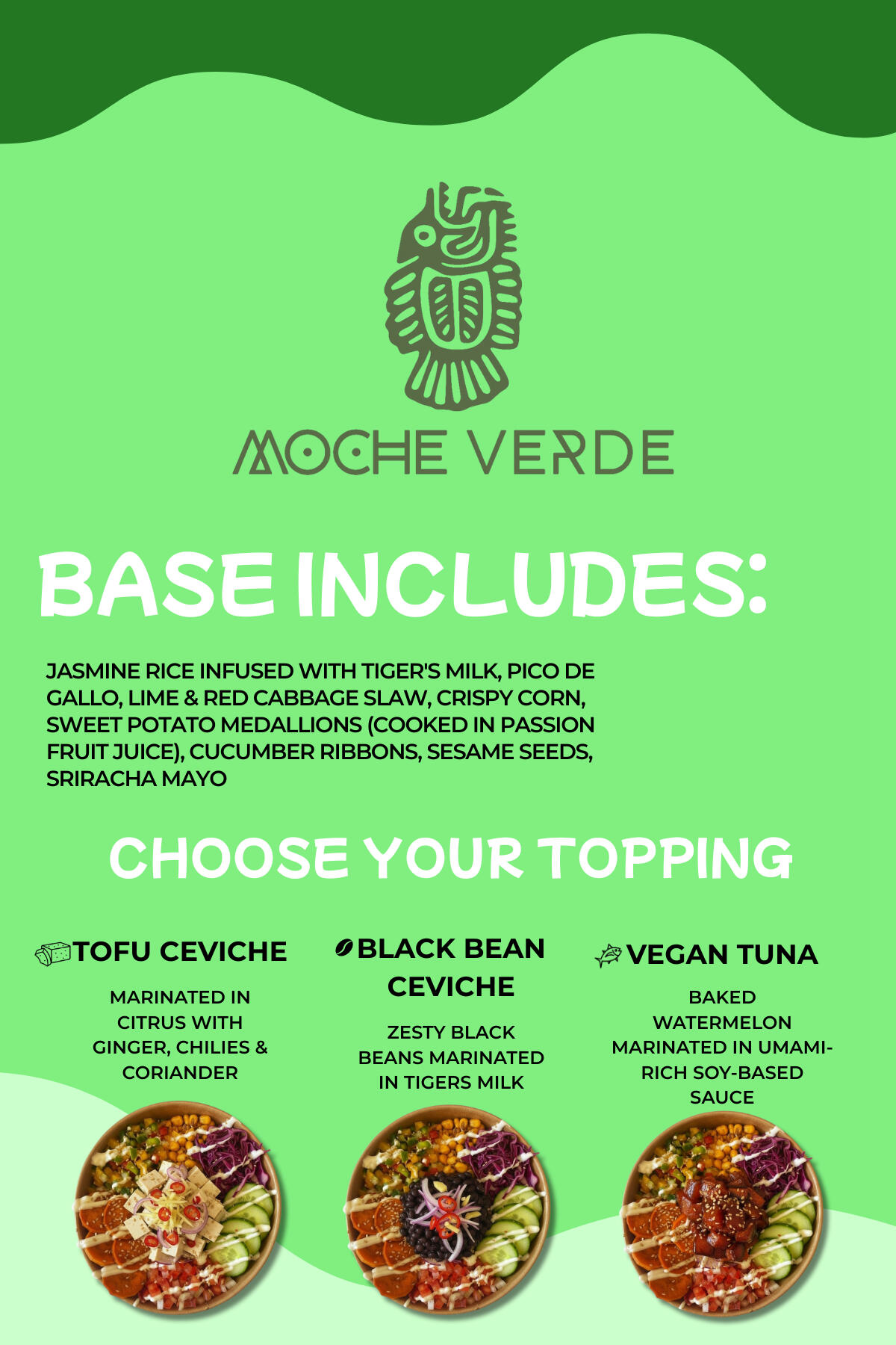 At Moche Verde, we craft pokebowls bursting with Latin-rooted zest and fresh flavors. Using only 100% fresh, unprocessed ingredients, we create bowls that brighten your day, make you smile, and inspire unforgettable moments.